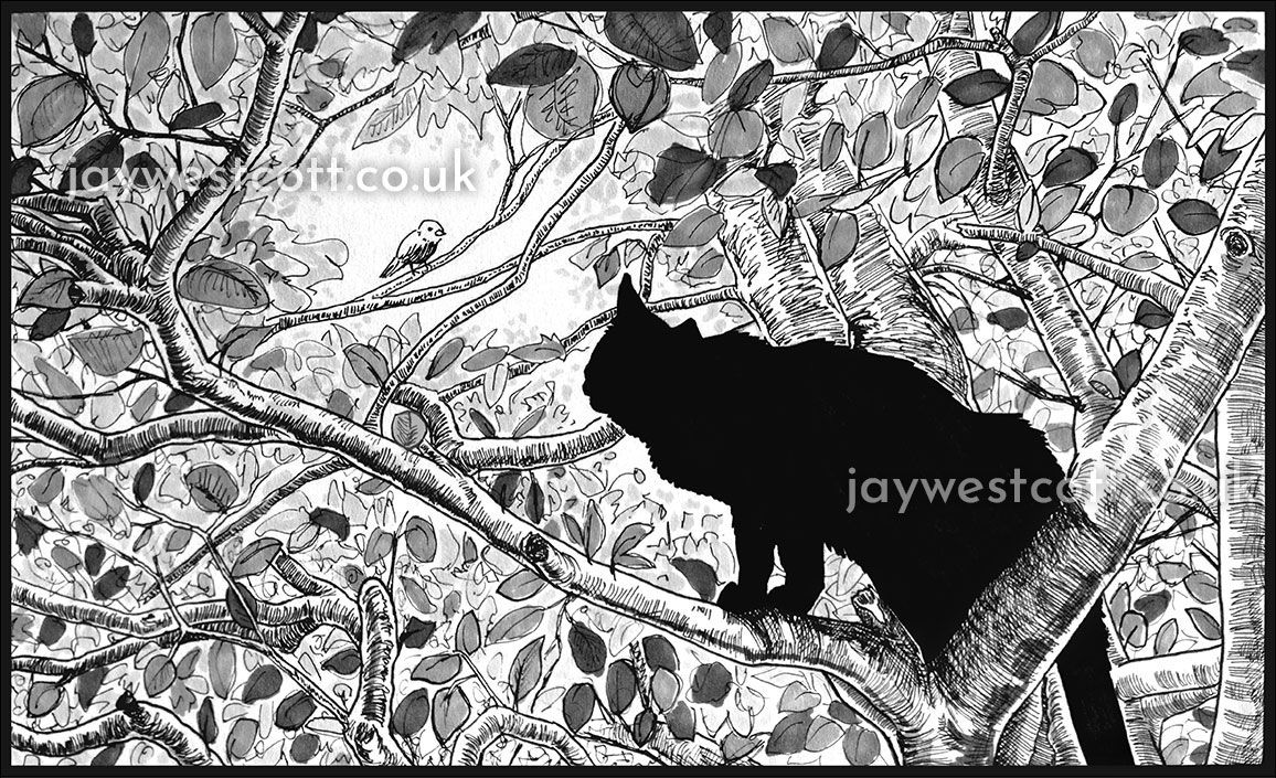 Pen & Ink sketch of my cat, Larry, climbing a tree.
